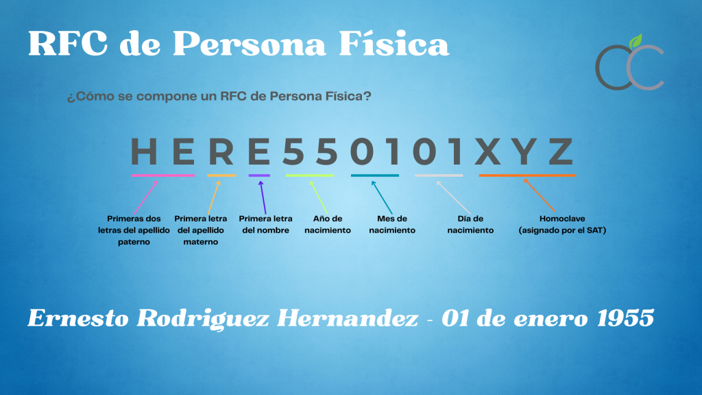En el caso de personas físicas, el RFC se integra por las primeras letras del nombre y apellidos, la fecha de nacimiento y una homoclave asignada por el SAT.
